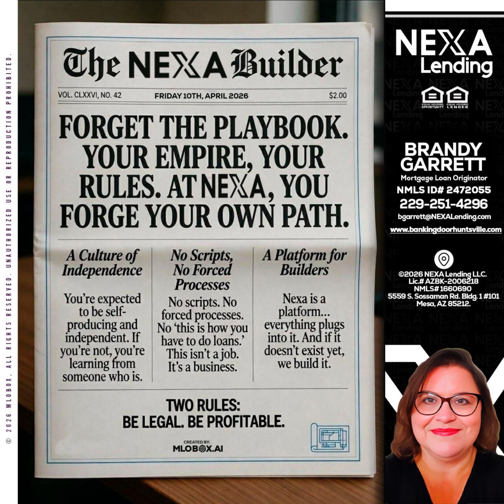 Hi, my name is Brandy Garrett. I’m a Loan Officer with NEXA Lending LLC., offering personalized mortgage solutions, fast customized quotes, great rates and service with integrity.